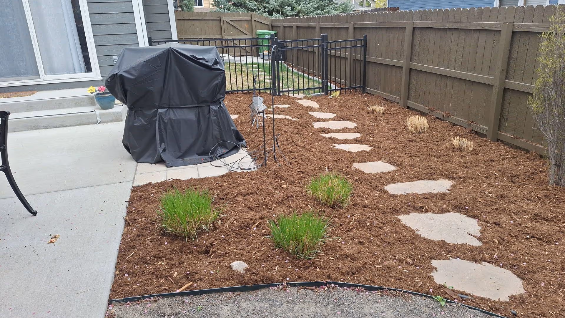 Softscape Material Installation: Mulch, plants, decorative elements, and soil enhancements.